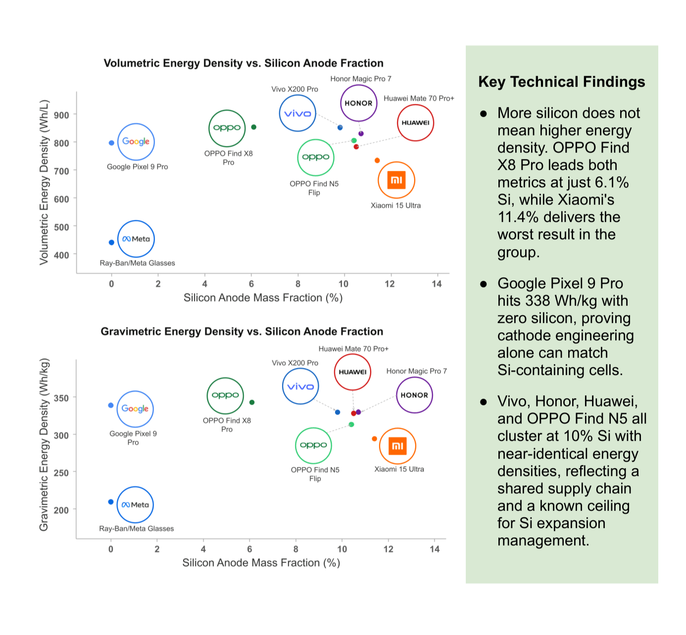 The headline finding for the investor: six of eight devices contained silicon in their anodes, with Si/C ratios ranging from 0.20 to 0.47. Only the Ray-Ban Meta Glasses and Google Pixel 9 Pro contained zero silicon.